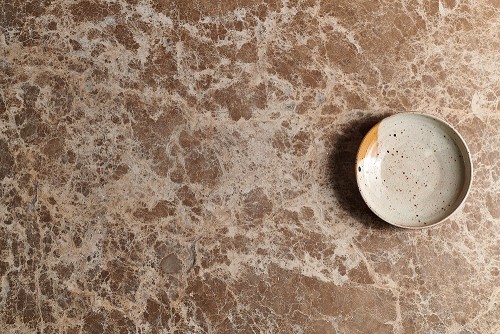 A multicolored pottery bowl on beige marble background