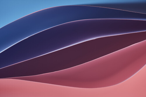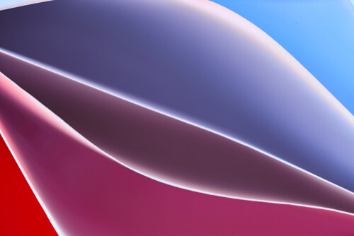 This image showcases an abstract paper art composition with paper curves in blue and red gradients created by colored light