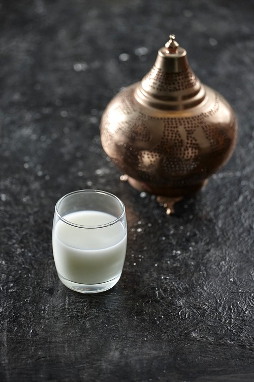 A golden lantern with different drinks, dates, nuts, prayer beads and quran on textured black background