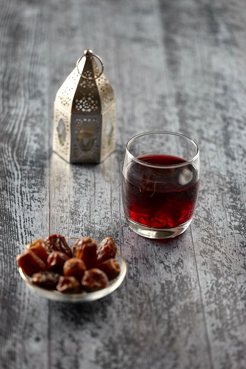 A silver lantern with different drinks, dates, nuts, prayer beads and quran on grey wooden background