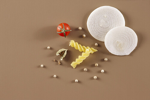Raw pasta with different ingredients such as cherry tomatoes, garlic, onions, red chilis, black pepper, white pepper, bay laurel leaves, rosemary and cardamom on beige background
