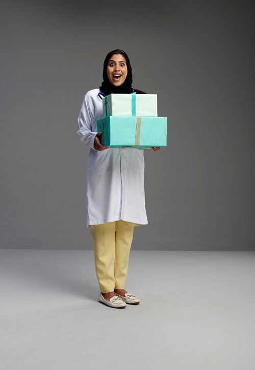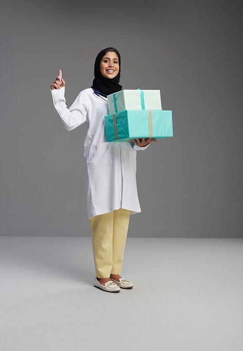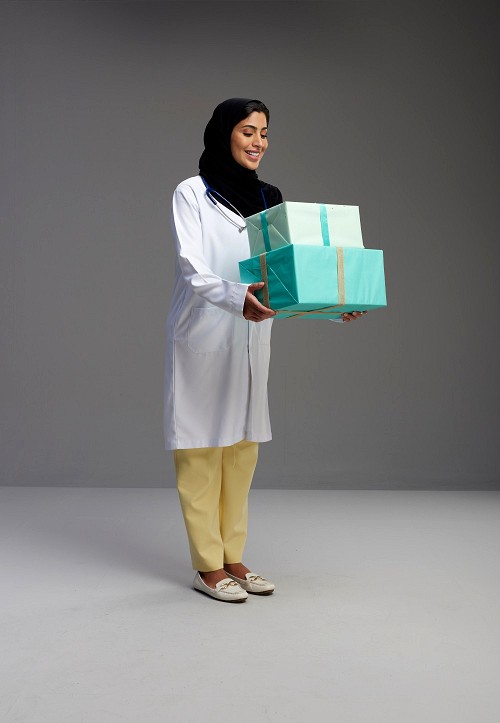 Saudi woman wearing lab coat with stethoscope standing holding gift box on Gray background