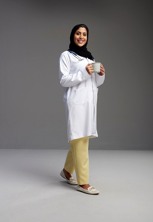 Saudi woman wearing lab coat with stethoscope standing holding mug on Gray background