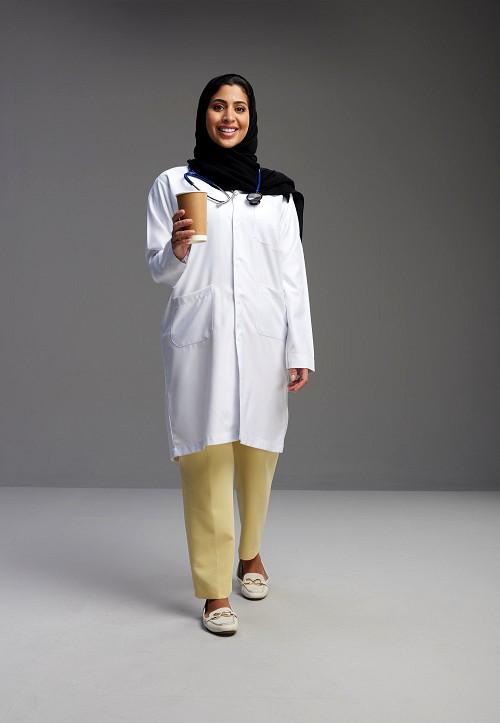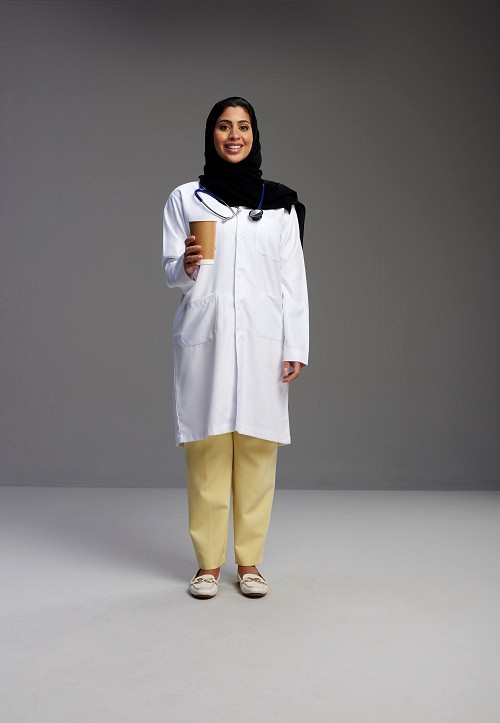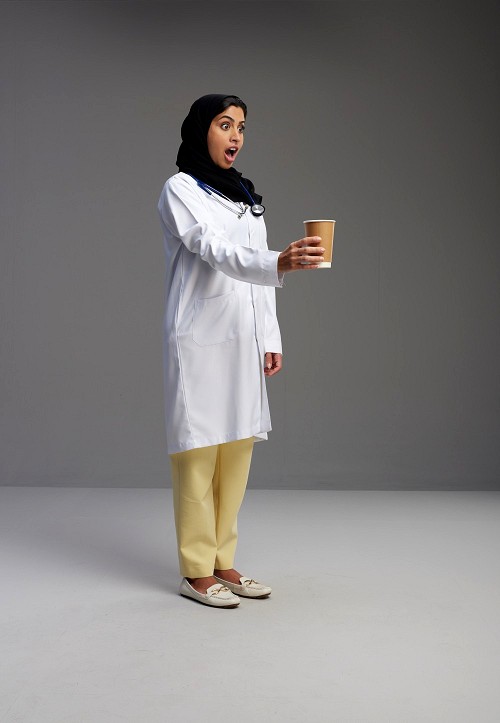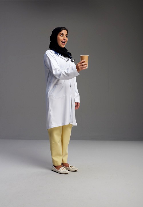 Saudi woman wearing lab coat with stethoscope standing holding paper cup on Gray background