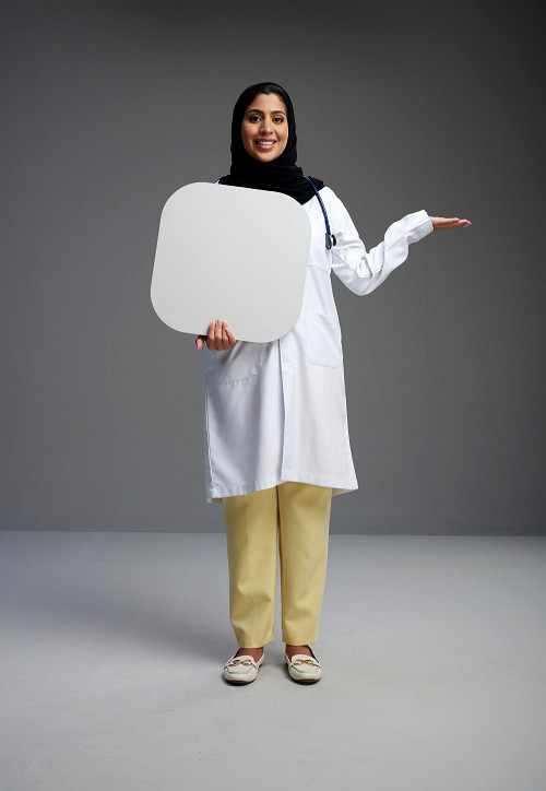 Saudi woman wearing lab coat with stethoscope standing holding social media sign on Gray background