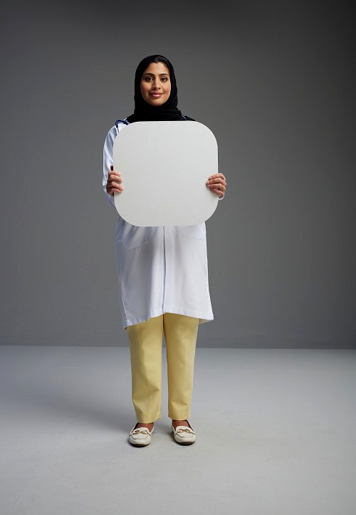 Saudi woman wearing lab coat with stethoscope standing holding social media sign on Gray background