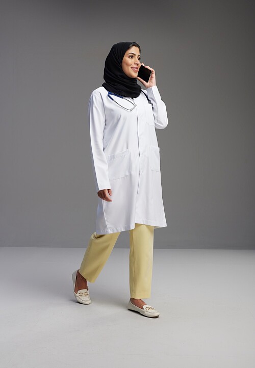 Saudi woman wearing lab coat with stethoscope standing talking on phone on Gray background