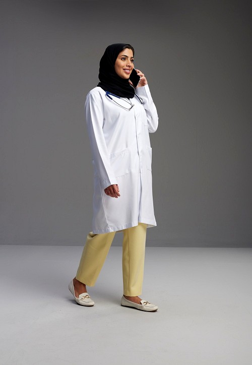 Saudi woman wearing lab coat with stethoscope standing talking on phone on Gray background