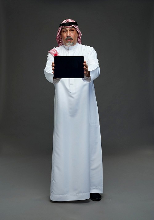 Saudi man with shomag Standing working on tablet on gray background