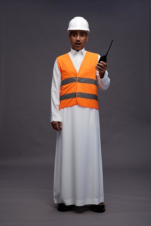 Saudi man wearing thob with engineer vest standing holding walkie-talkie on gray background