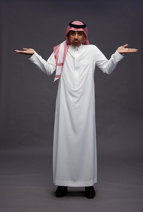 Saudi man wearing thob and shomag standing interacting with the camera on gray background