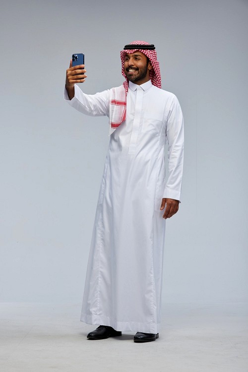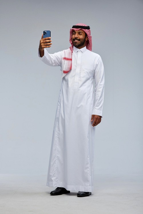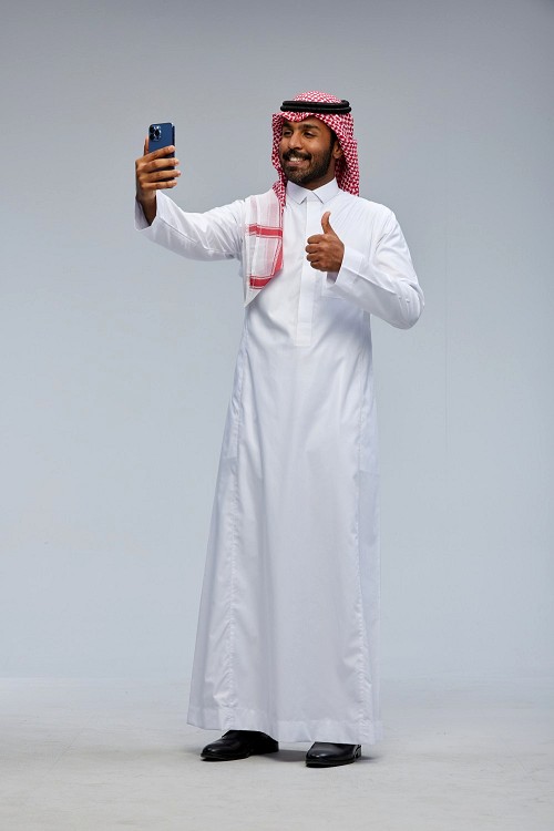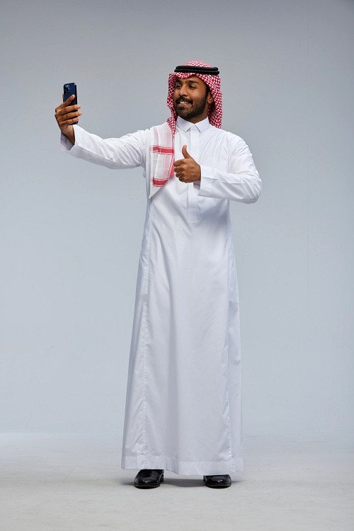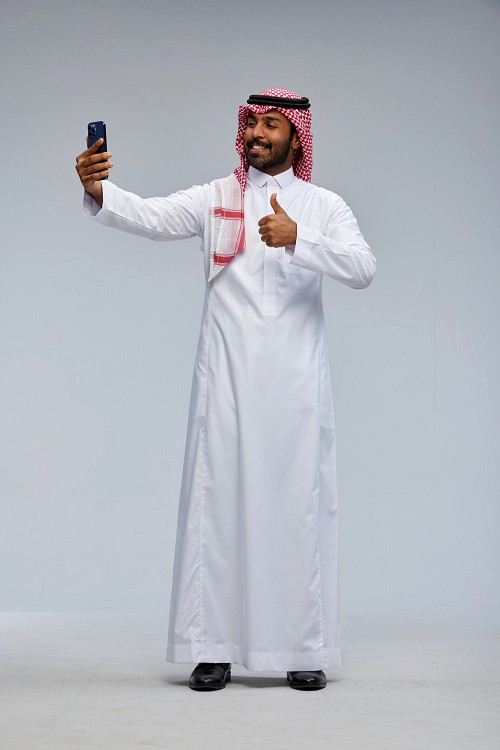 Saudi man wearing thob standing taking selfie on gray background