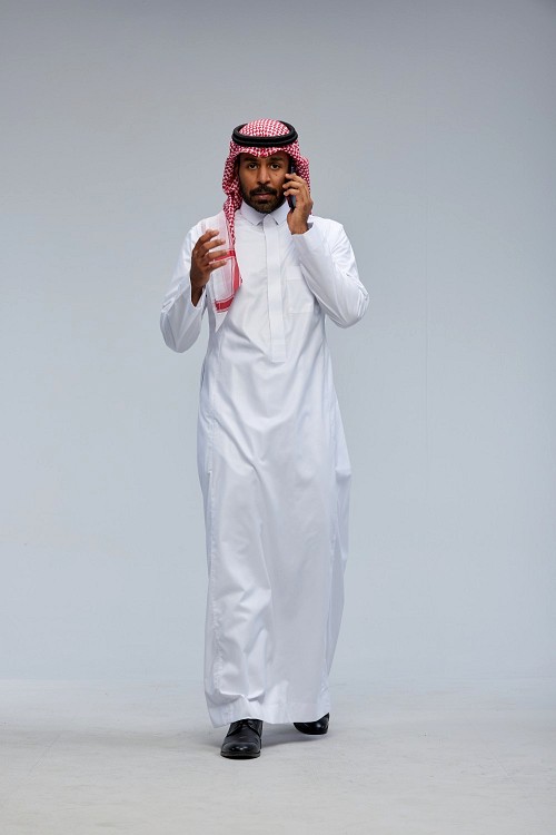 Saudi man Wearing Thob and shomag standing talking on phone on Gray background