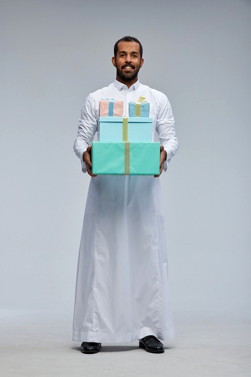 Saudi man Wearing thob standing holding gift box on Gray background