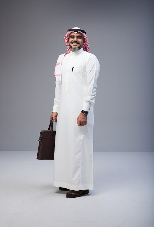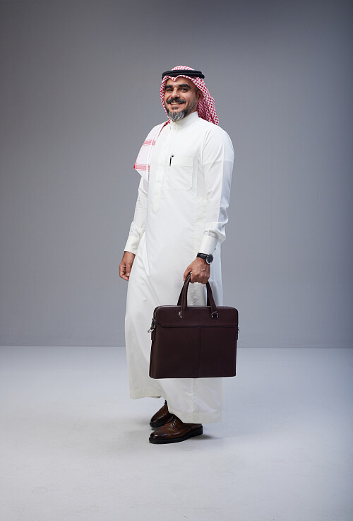 Saudi man Wearing Thob and red Shomag standing holding bag on Gray background
