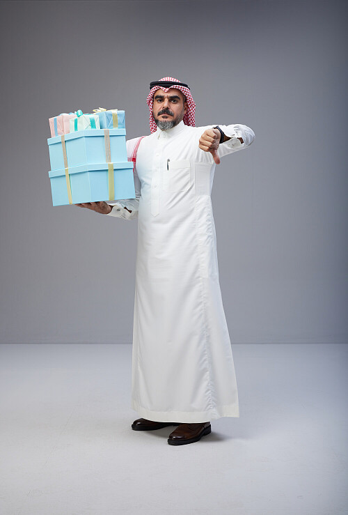 Saudi man Wearing Thob and red Shomag standing holding gift box on Gray background