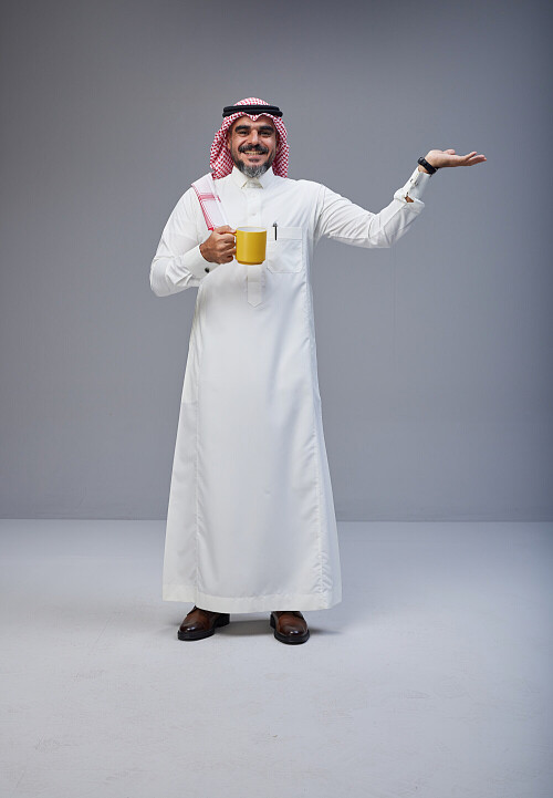 Saudi man Wearing Thob and red Shomag standing holding mug on Gray background