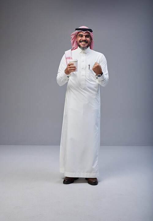 Saudi man Wearing Thob and red Shomag standing holding paper cup on Gray background