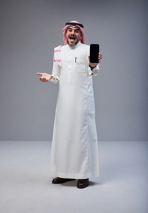 Saudi man Wearing Thob and red Shomag standing showing phone to camera on Gray background
