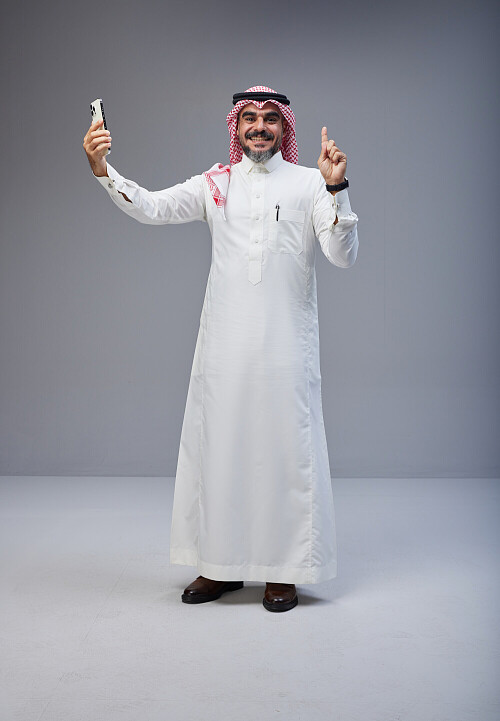 Saudi man Wearing Thob and red Shomag standing taking selfie on Gray background