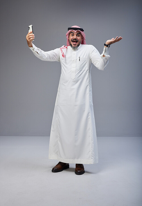 Saudi man Wearing Thob and red Shomag standing taking selfie on Gray background