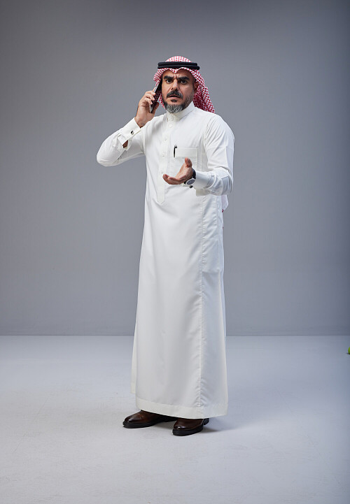 Saudi man Wearing Thob and red Shomag standing talking on phone on Gray background