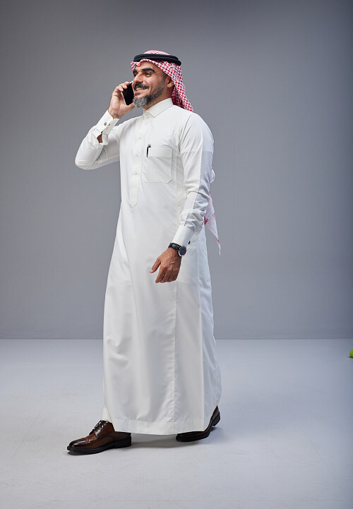 Saudi man Wearing Thob and red Shomag standing talking on phone on Gray background