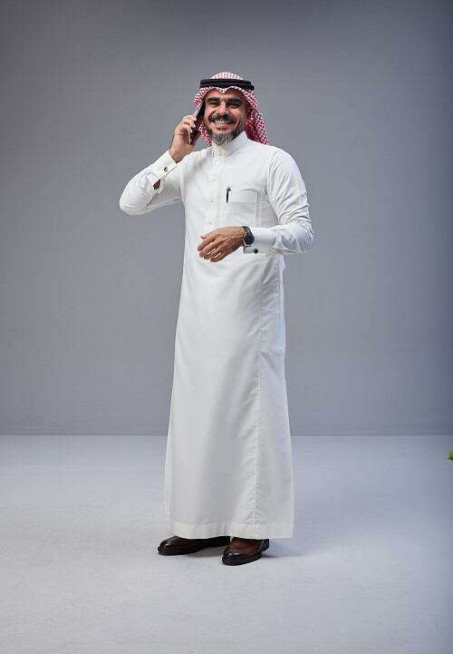 Saudi man Wearing Thob and red Shomag standing talking on phone on Gray background