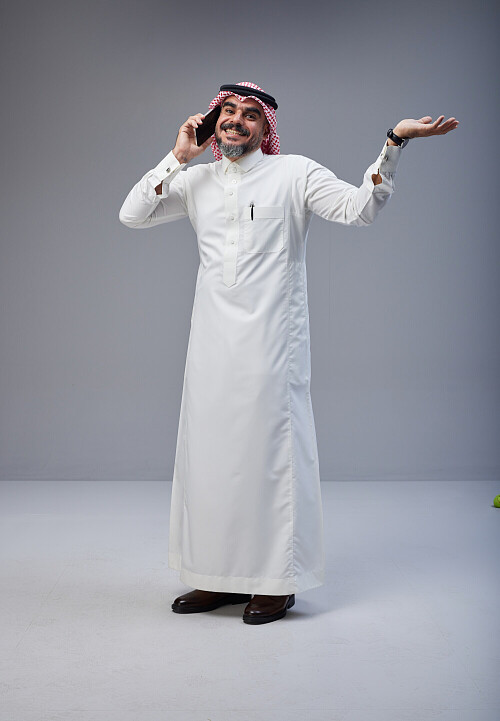Saudi man Wearing Thob and red Shomag standing talking on phone on Gray background