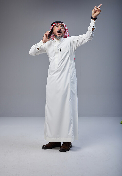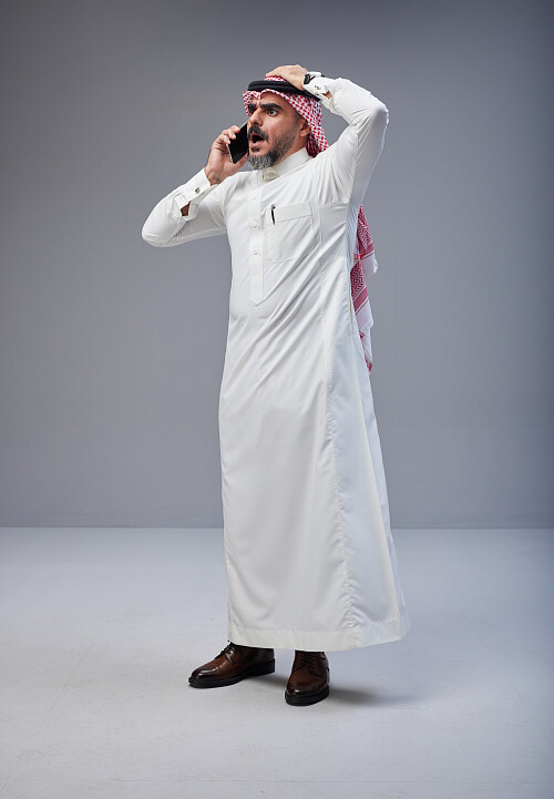 Saudi man Wearing Thob and red Shomag standing talking on phone on Gray background