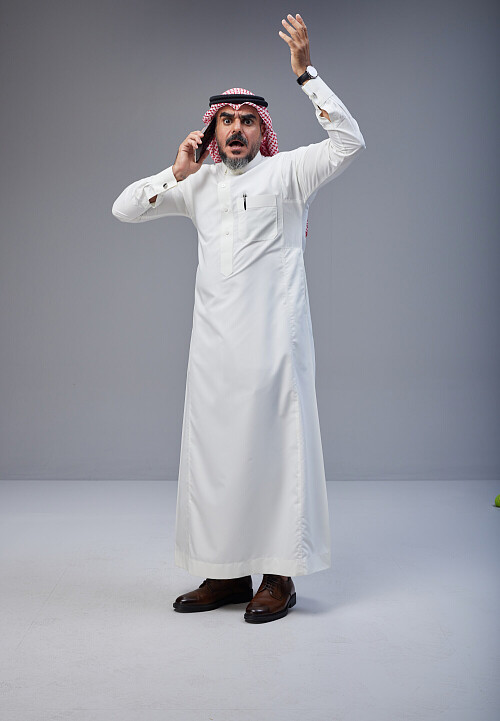 Saudi man Wearing Thob and red Shomag standing talking on phone on Gray background