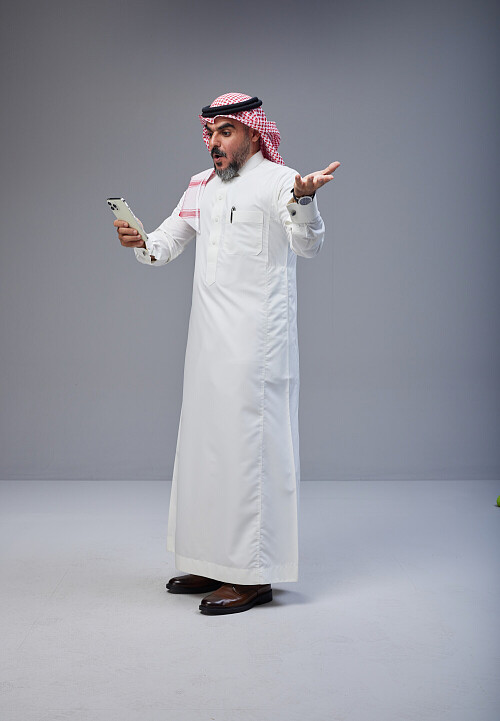 Saudi man Wearing Thob and red Shomag standing texting on phone on Gray background