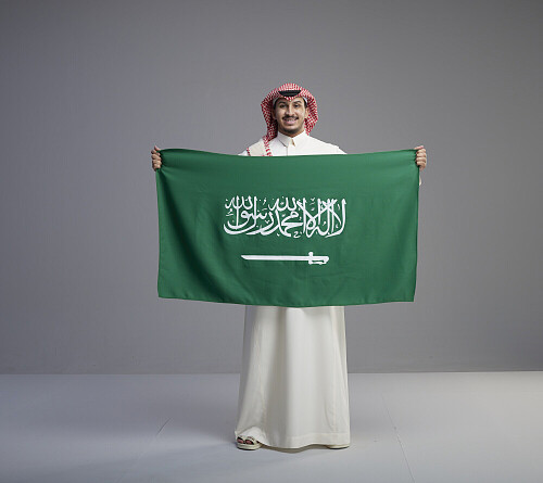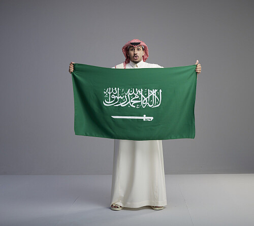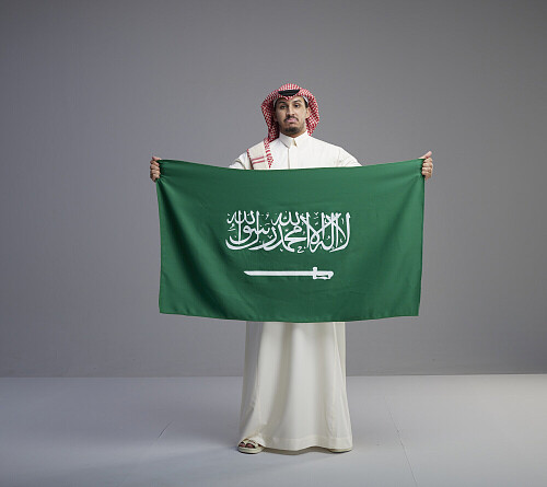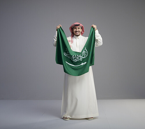 Saudi man Wearing Thob and red white Shomag standing interacting with the camera on Gray background