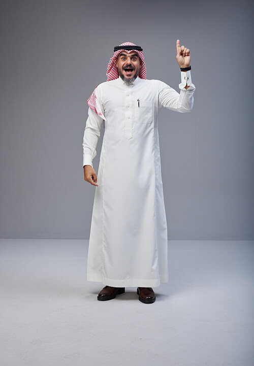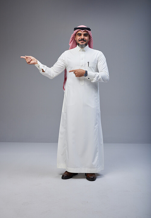 Saudi man Wearing Thob and red white Shomag standing interacting with the camera on Gray background