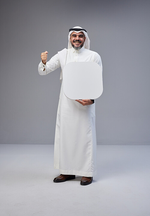 Saudi man Wearing Thob and white Shomag standing holding social media sign on Gray background