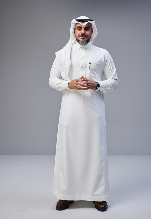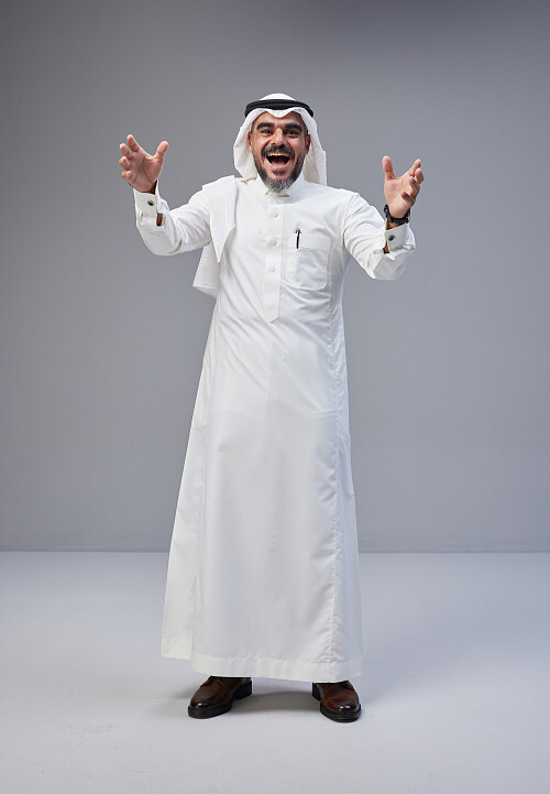 Saudi man Wearing Thob and white Shomag standing interacting with the camera on Gray background