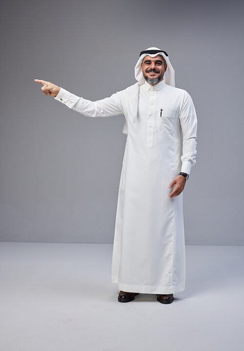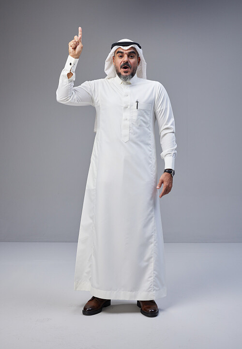 Saudi man Wearing Thob and white Shomag standing interacting with the camera on Gray background