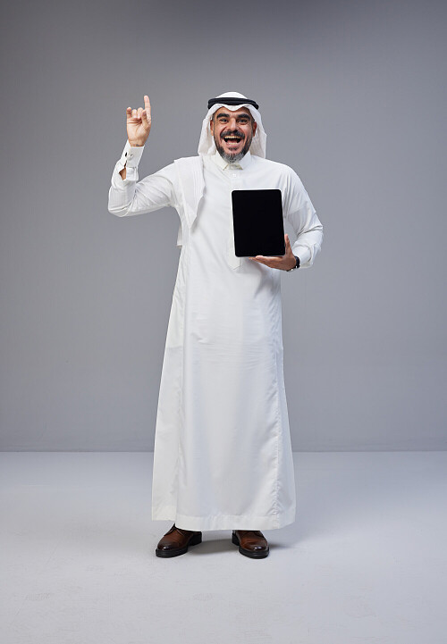 Saudi man Wearing Thob and white Shomag standing showing tablet to camera on Gray background