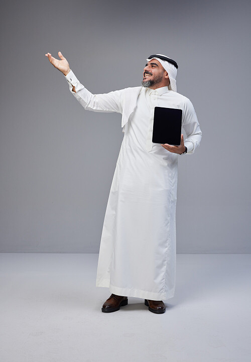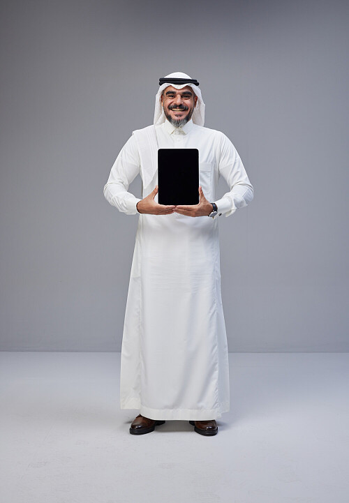Saudi man Wearing Thob and white Shomag standing showing tablet to camera on Gray background
