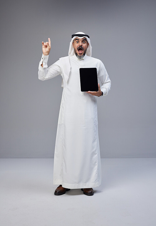 Saudi man Wearing Thob and white Shomag standing showing tablet to camera on Gray background