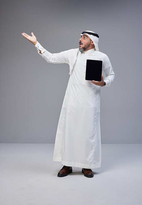 Saudi man Wearing Thob and white Shomag standing showing tablet to camera on Gray background