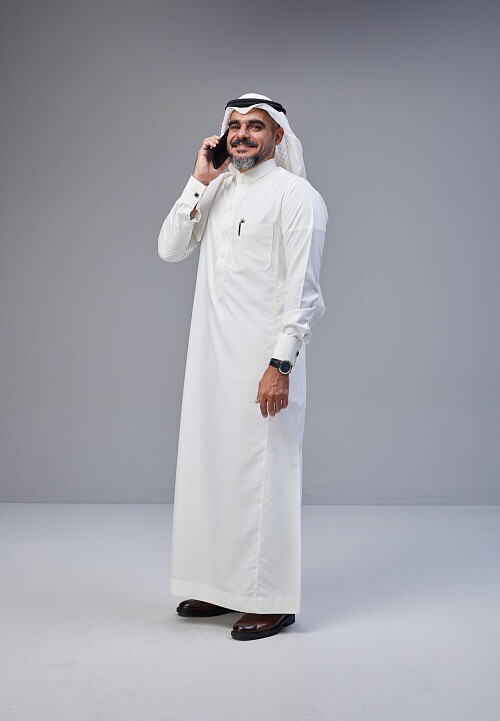 Saudi man Wearing Thob and white Shomag standing talking on phone on Gray background