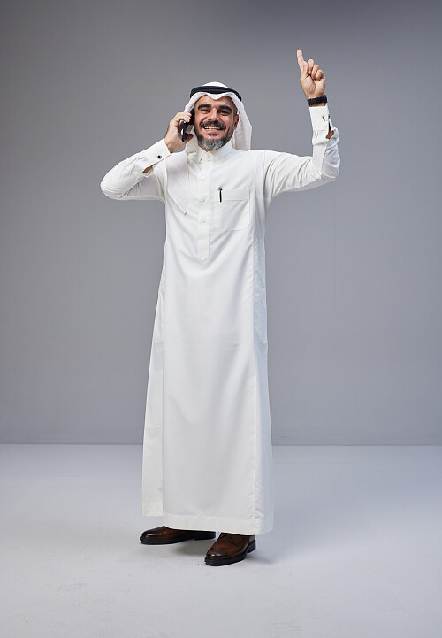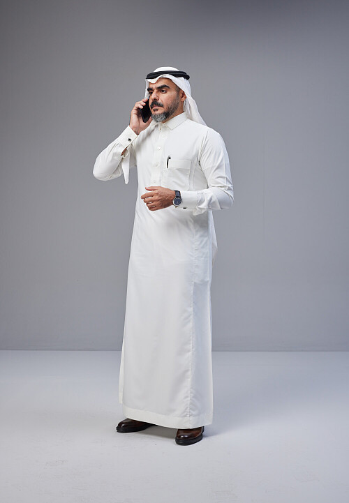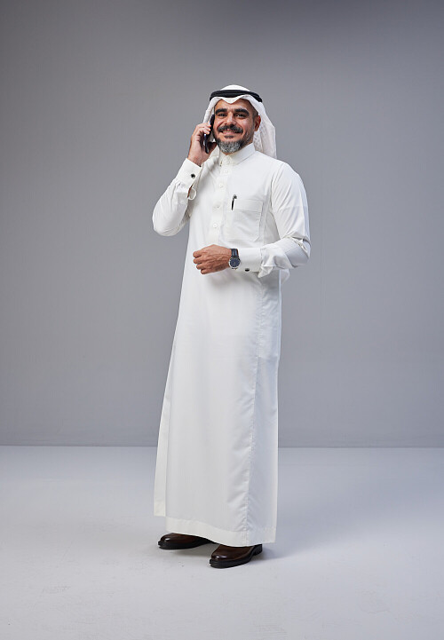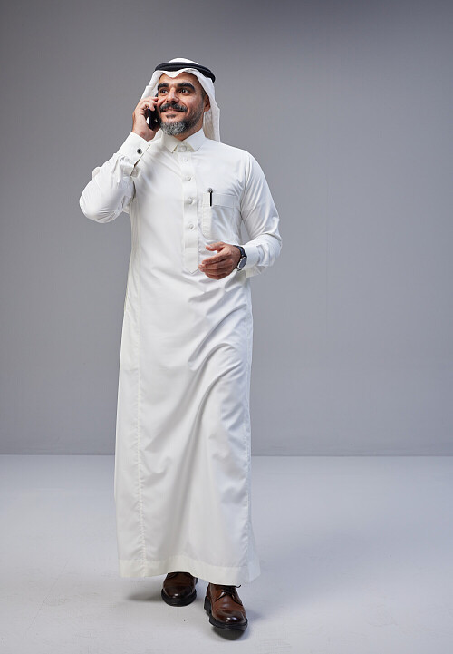 Saudi man Wearing Thob and white Shomag standing talking on phone on Gray background