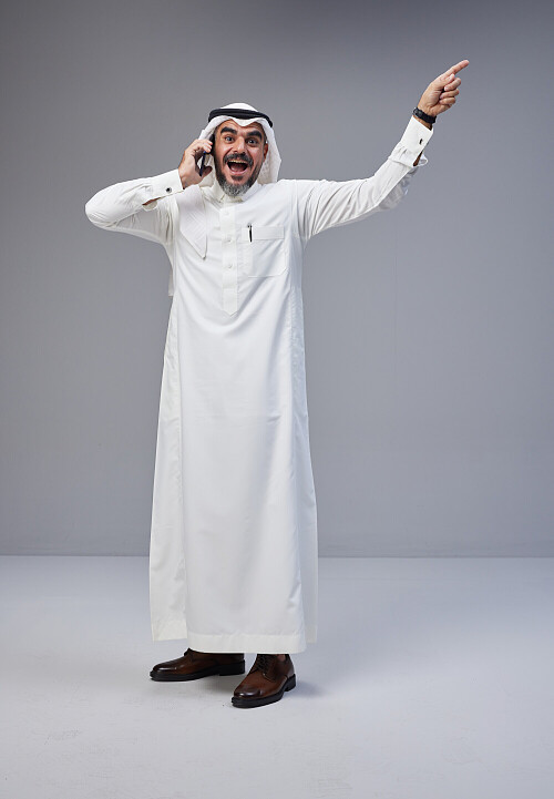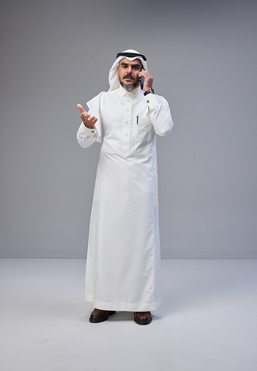 Saudi man Wearing Thob and white Shomag standing talking on phone on Gray background
