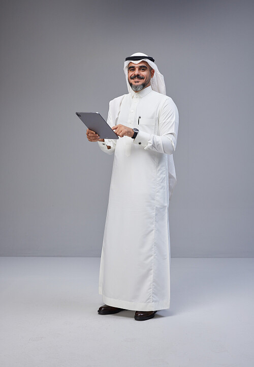 Saudi man Wearing Thob and white Shomag standing working on tablet on Gray background