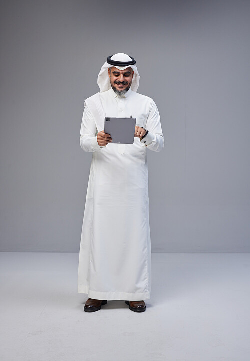 Saudi man Wearing Thob and white Shomag standing working on tablet on Gray background