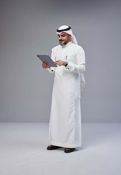 Saudi man Wearing Thob and white Shomag standing working on tablet on Gray background