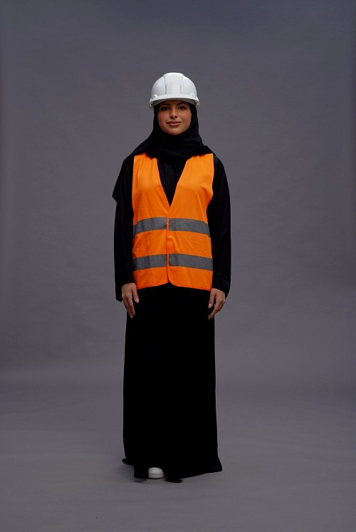 Saudi woman wearing Abaya standing interacting with the camera on gray background