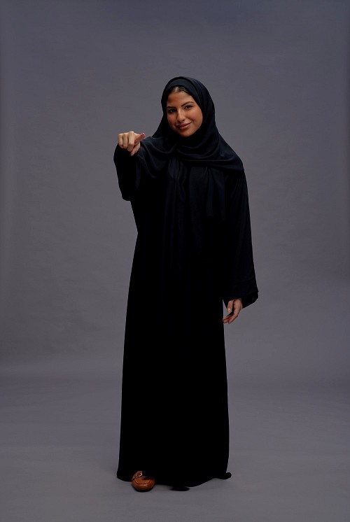 Saudi woman wearing Abaya standing interacting with the camera on gray background