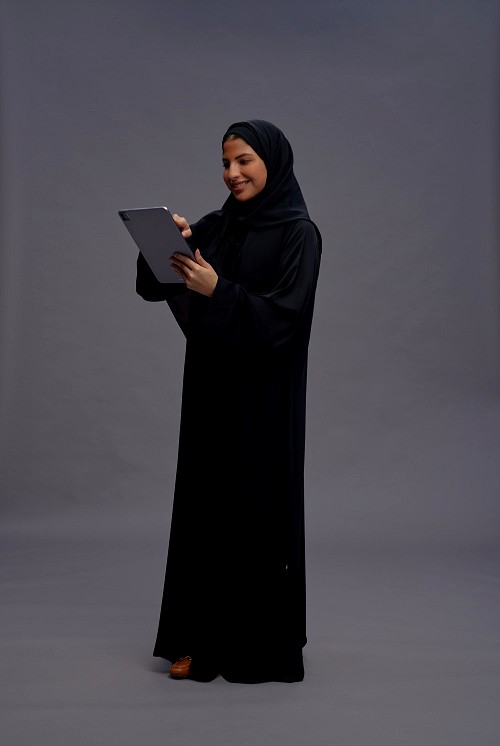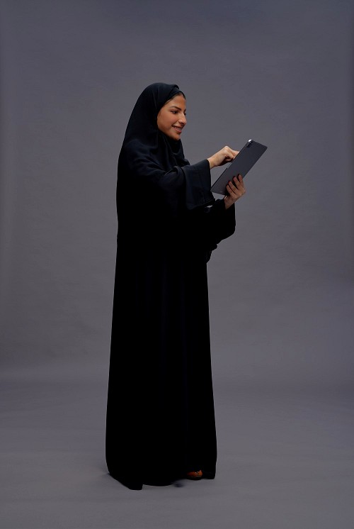 Saudi woman wearing Abaya standing working on tablet on gray background